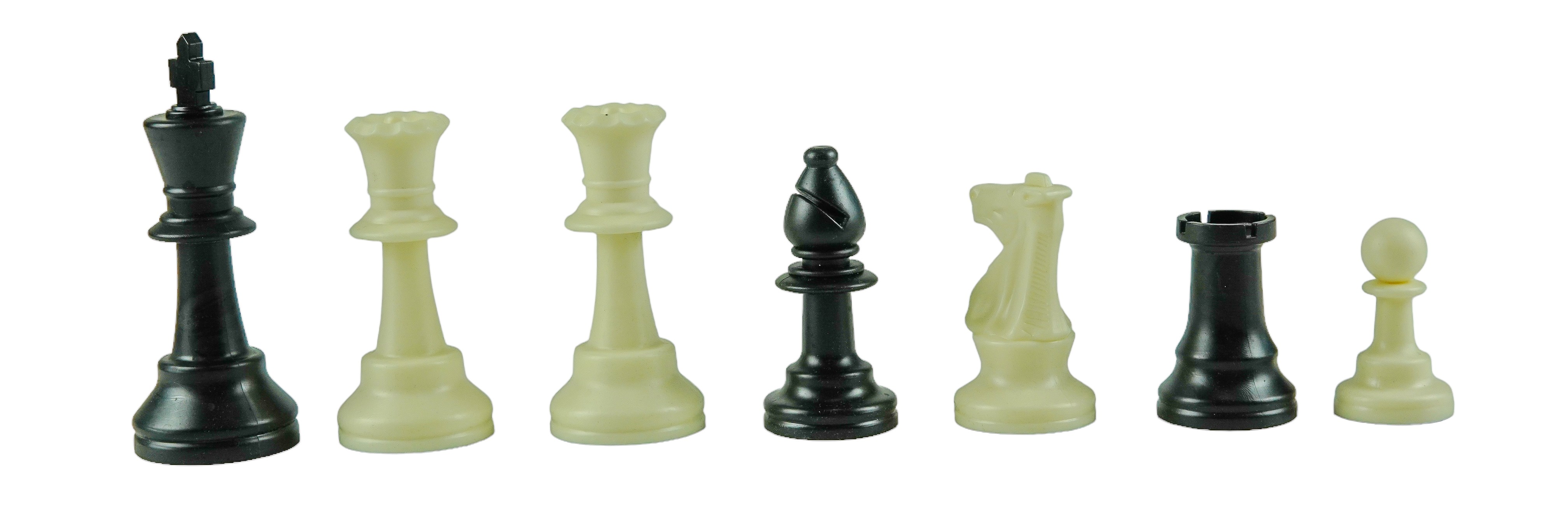 Black & ivory plastic chessmen double weighted with felted bottoms & two extra queens King Height: 3 1/2" Base diameter: 1 1/2"